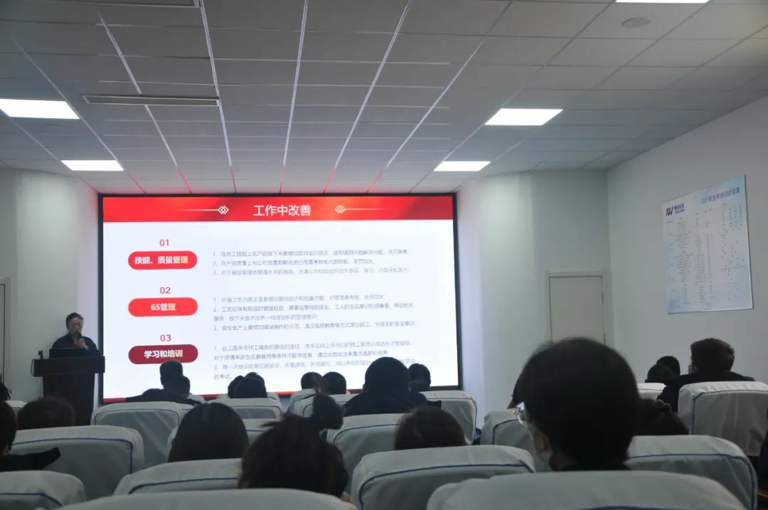 生產(chǎn)部部長從“去年工作回顧”“取得工作成果”“工作不足改善”“新年工作計(jì)劃”四個(gè)方面出發(fā),對2021的全年工作情況進(jìn)行了總結(jié)概述,匯報(bào)了本年度生產(chǎn)任務(wù)的完成情況,重點(diǎn)強(qiáng)調(diào)了安全生產(chǎn)管理,提出要時(shí)刻做到“警鐘長鳴”,認(rèn)真執(zhí)行安全操作管理規(guī)定,落實(shí)安全培訓(xùn),讓安全意識深入人心;展示了2021年各方面工作取得的成果,同時(shí)指出了工作中存在的不足及改善措施,并提出了相關(guān)建議,制定了2022年的工作目標(biāo)。